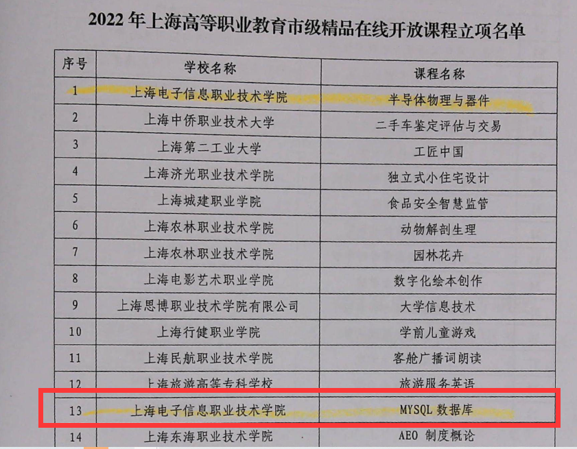 近日,上海市教育委员会公布了2022年度上海高职高专院校市级精品在线开放课程立项名单,我院华文立老师主讲的《MySQL数据库》在线课程成功入选。
