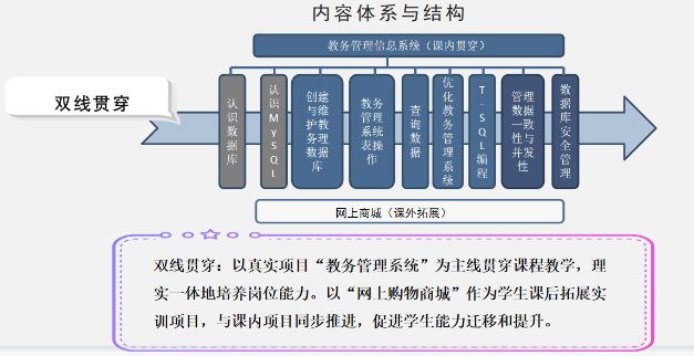 《MySQL数据库》是我院“人工智能技术应用一流专业群”(2021年上海市级立项)底层通用共享课程。该课程在分析专业群岗位能力需求基础上,全面落实立德树人总要求,围绕数据库分析、设计等典型工作任务,组织教学内容;以项目为载体,以任务为驱动,坚持理实一体,进行教学设计。教学内容实战性强,在做中学,在做中教,科学处理隐性知识与显性知识的关系,着重学生职业能力培养的同时,努力提升学生自主学习、探究能力,聚焦学生可持续发展能力培养。最终培养具备数据库技术和素养数据库开发工程师、DBA等高素质技术技能型人才。