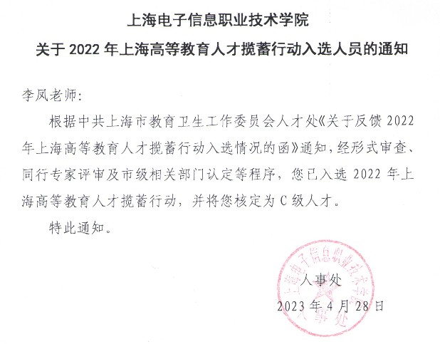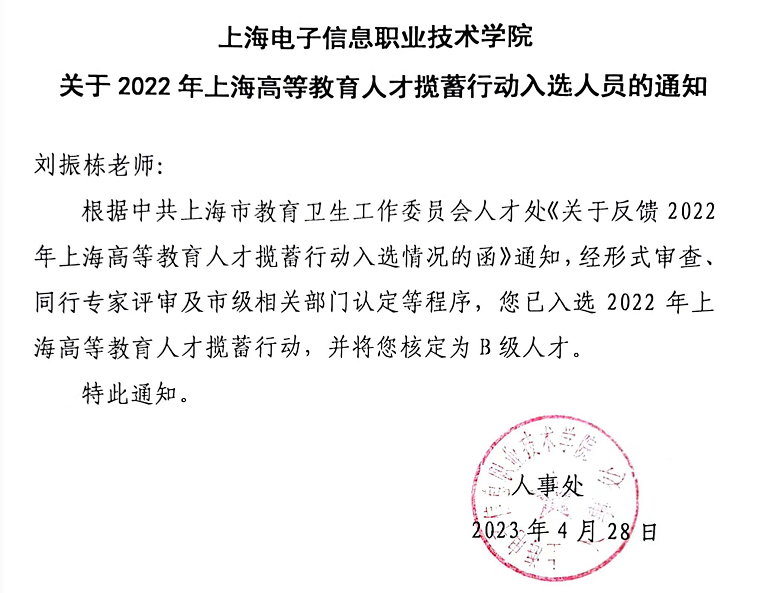 根据中共上海市教育卫生工作委员会人才处《关于反馈2022年上海高等教育人才揽蓄行动入选情况的函》通知,经形式审查、同行专家评审及市级相关部门认定等程序,我院刘振栋教授、罗敏副教授、李凤副教授三人入选2022年上海高等教育人才揽蓄行动,其中刘振栋教授被核定为B类人才。罗敏副教授、李凤副教授被核定为C类人才。(供稿:李露露)