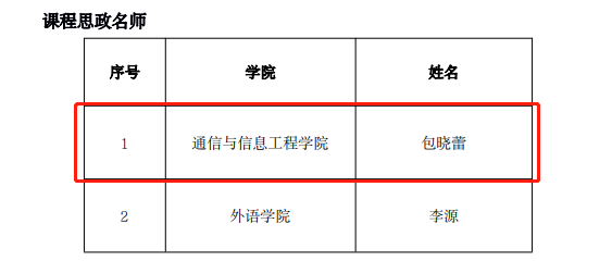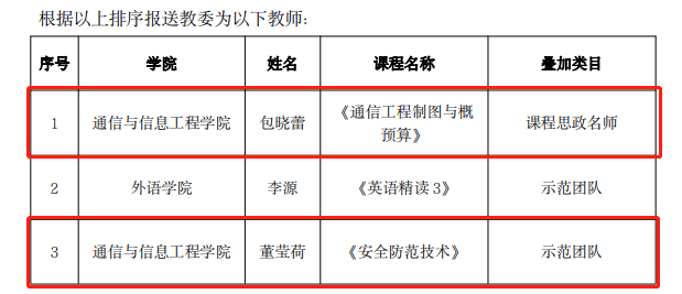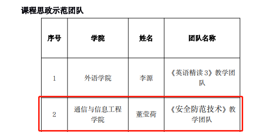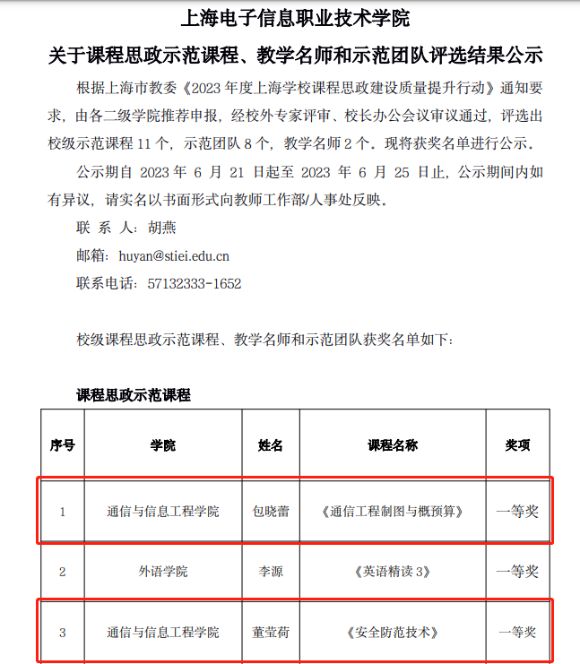 近日,学校发布《上海电子信息职业技术学院课程思政示范课程、教学名师和示范团队公示》,我院两门课程《通信工程制图与概预算》、《安全防范技术》被评为校级课程思政示范课程,包晓蕾老师被评为校级课程思政教学名师,董莹荷老师为带头人的团队被评为校级课程思政示范团队,根据专家打分排序,我院2门校级课程思政示范课程、1个教学名师、1个示范团队被报送教委参加市级评选。