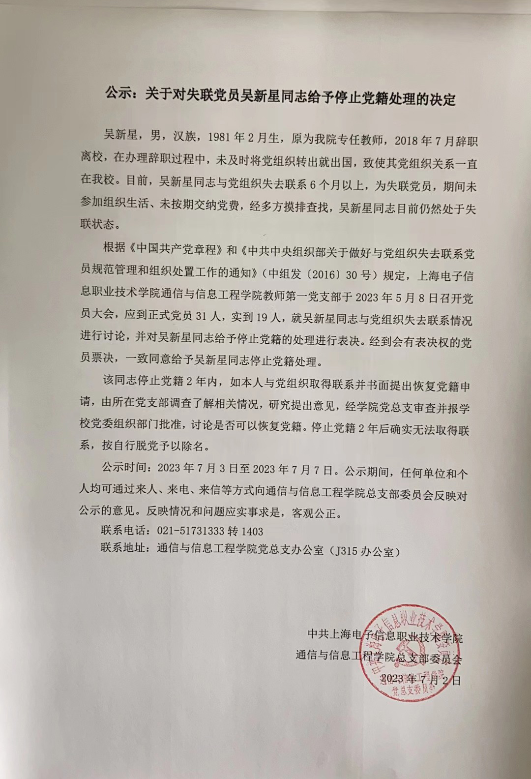 公示:关于对失联党员吴新星同志给予停止党籍处理的决定