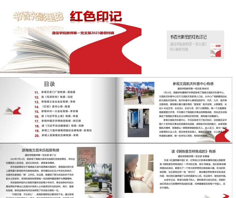 为了更好地学习、贯彻习近平新时代中国特色社会主义思想,2023年暑期,通信与信息工程学院教师第一党支部开展“书香光影里的红色印记”专题党建活动,组织支部党员利用假期,完整品读一本红色书籍、观赏一部红色电影、游览一方革命圣地,通过文字和图片记录自己的体会感悟。