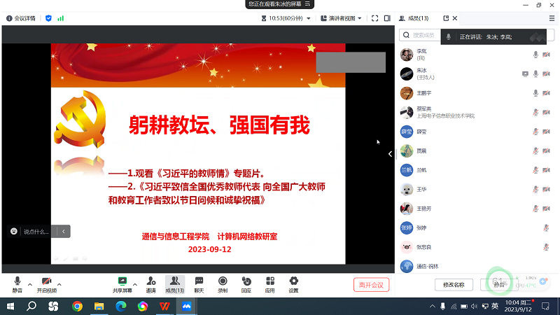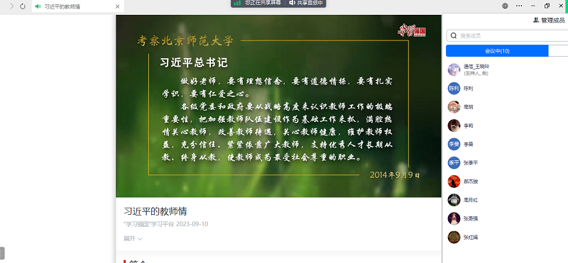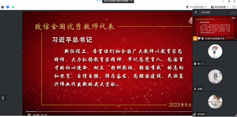 9月11日至13日,我院以教研室为单位线上组织全体教师观看专题片《习近平的教师情》,学习习近平总书记致全国优秀教师代表的信。