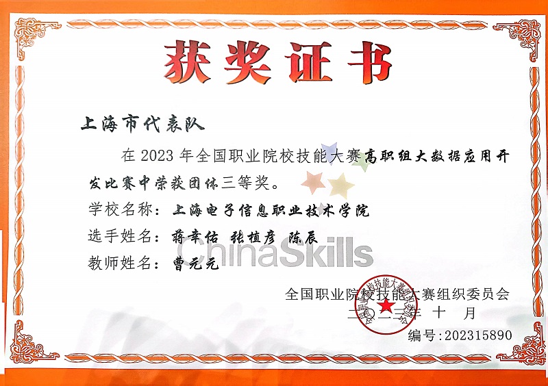 10月23日,2023年全国职业院校技能大赛大数据应用开发赛项在海南省琼海市南海博物馆举行。本次比赛采用师生同赛形式进行,我院教师曹元元和学生蒋幸佑、陈辰、张植彦组成的参赛队参加比赛,与来自全国64所高职院校的参赛队同场竞技。经过一天紧张激烈的竞技,我院参赛队获得三等奖。