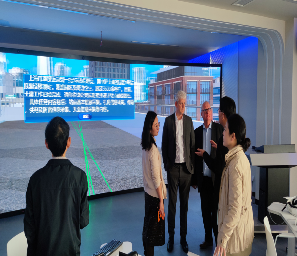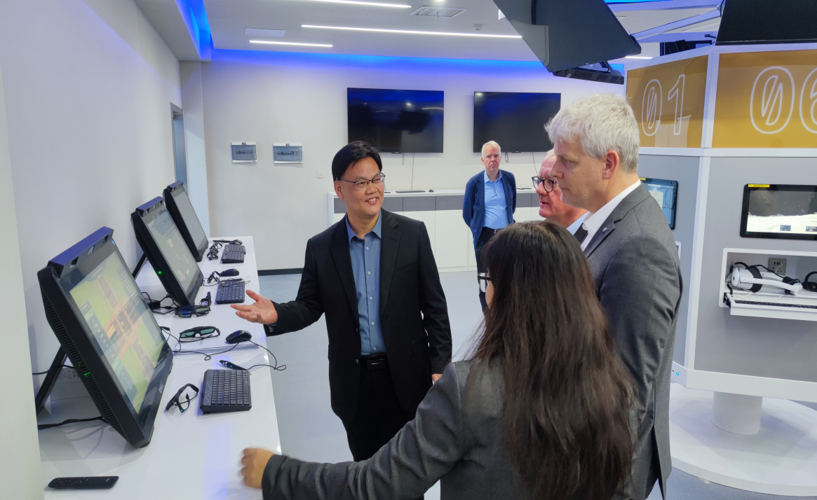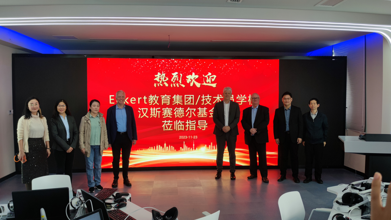 在参观专业虚拟仿真中心和体验中心过程中,程堂柏老师详细介绍基于XR技术的数字化创新教学模式,对体验中心内容进行详细讲解;德方参观老师进行实际体验和详细问题讨论。
