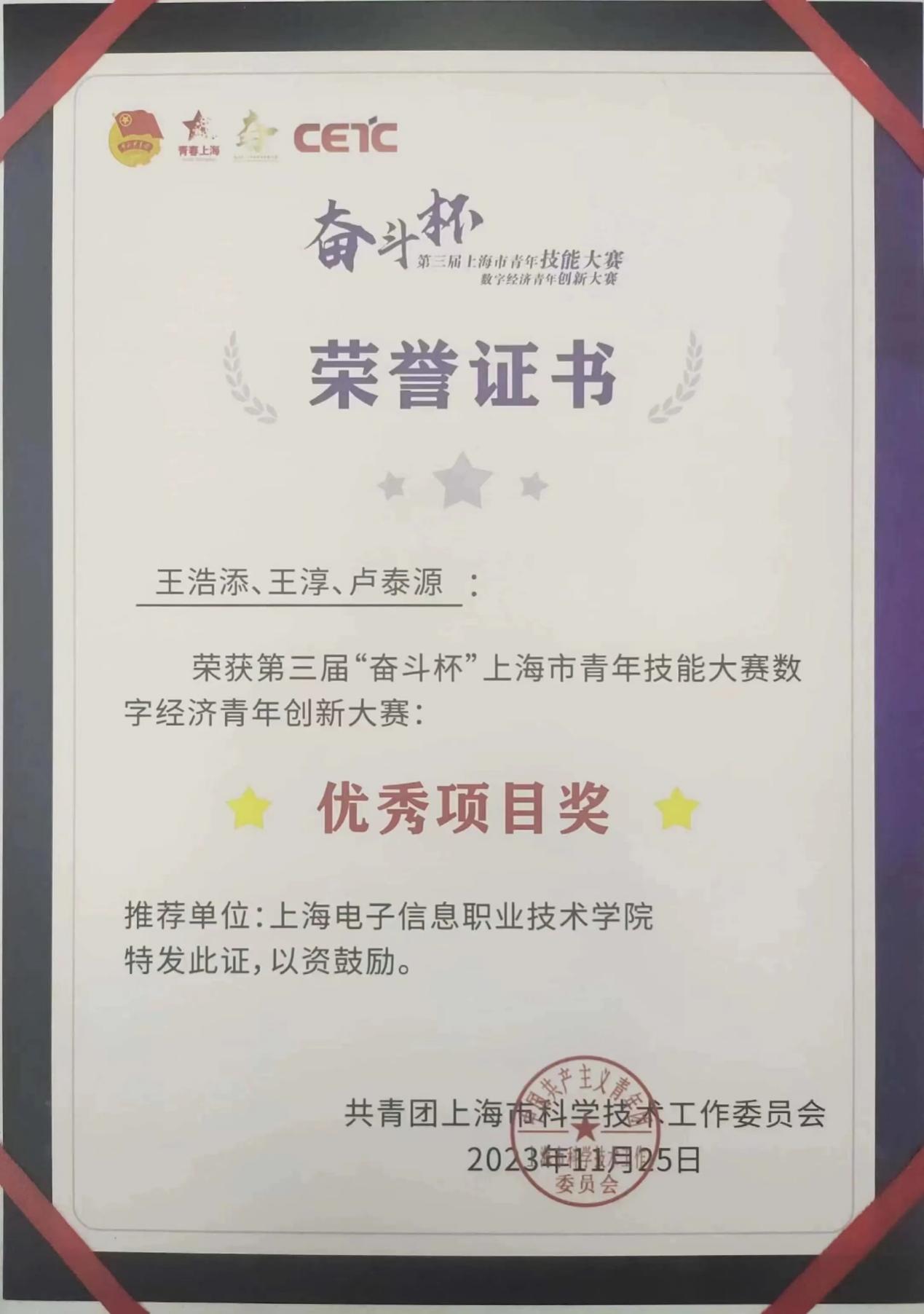 2023年11月25日,“奋斗杯”上海市青年技能大赛数字经济青年创新大赛决赛在电科数字嘉定所区圆满落幕。历经4个月的紧张赛程,我院194通信2班(一贯)卢泰源及机械与能源工程学院学生王浩添、王淳三名同学设计的“神兽TV-计算环境管理器”项目脱颖而出,荣获“优秀项目奖”,这也是我校首次在“奋斗杯”上海市青年技能大赛中获奖。