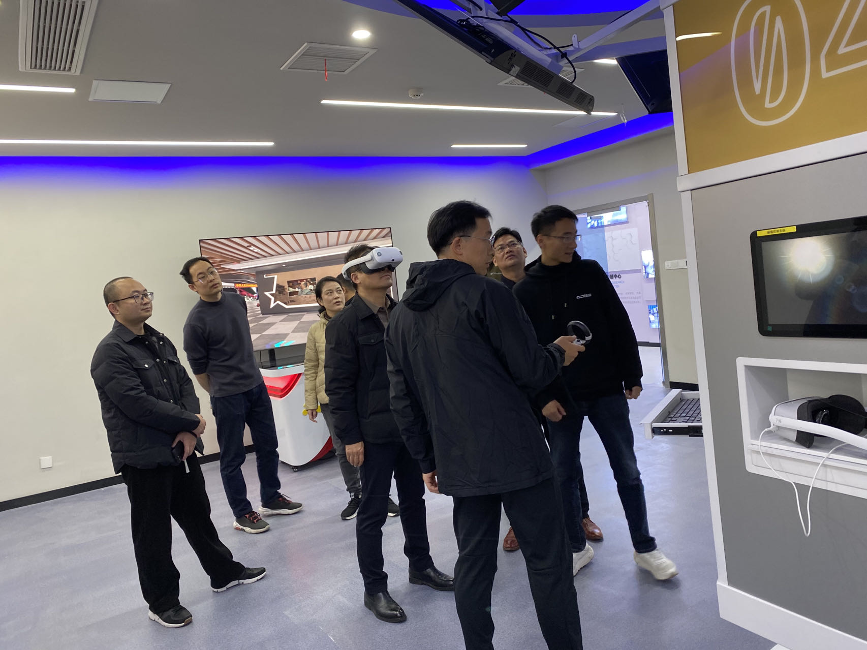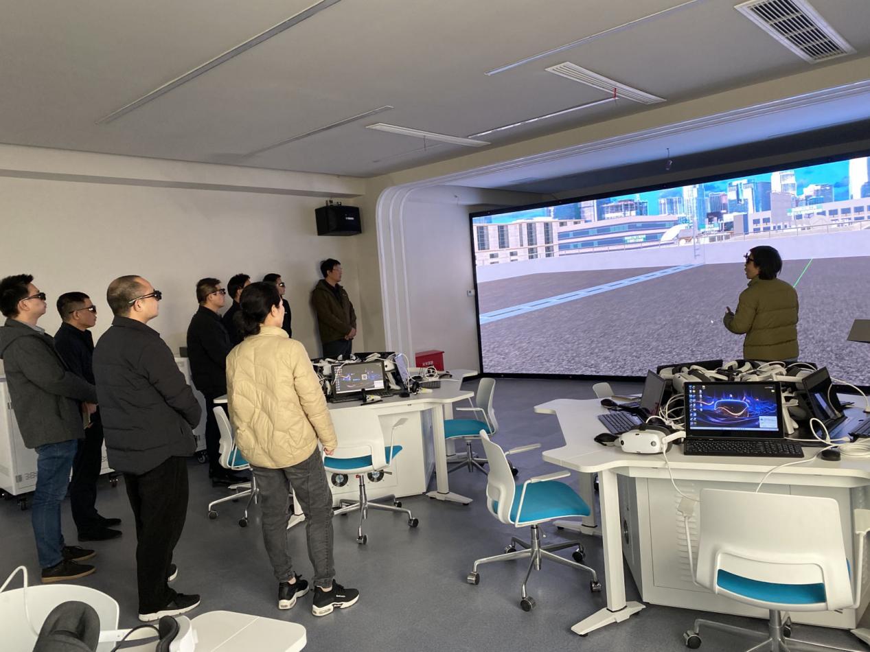 随后嘉兴市建筑工业学校一行来到专业虚拟仿真实训中心,中心建设有沉浸式LED大屏、桌面式操作一体机、PC单机版软件和VR桌面系统。实训老师现场演示了沉浸式LED大屏5G基站勘察课程,向参观老师展示了5G基站建设的实景和操作流程。又来到虚拟仿真体验中心,对党建内容通过VR实景的形式呈现非常感兴趣,并且在将来可以开发VR课程思政。老师们带上VR头盔,亲自体验科普教育和5G八大应用场景等VR虚拟体验等内容。在虚实结合专业实训中心,对5G基站的虚实结合场景、物联网虚实结合应用场景,对如何更好的发挥虚实协同进行了深入交流。