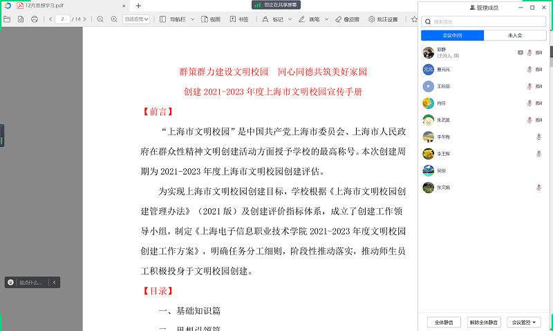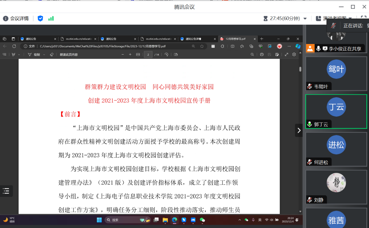为进一步加强学院教师对学校创建上海市文明校园工作的认识、了解掌握文明校园创建有关知识,引导教师积极支持配合迎检工作,近日,我院各教研室组织教师专题学习《创建2021-2023年度上海市文明校园宣传手册》。