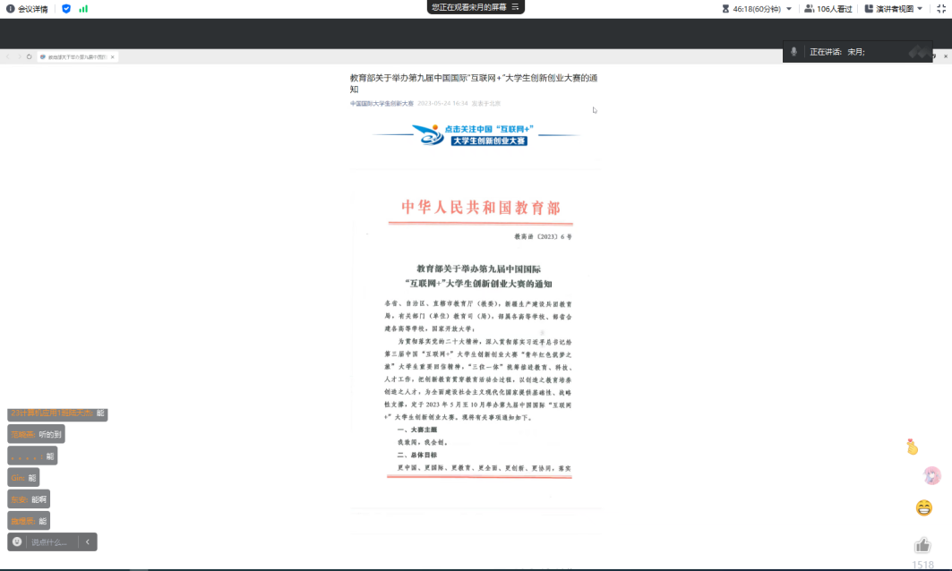 首先,宋月为大家科普了什么是互联网+创新创业大赛,并对大赛的赛程进行了详细的介绍。然后,对于前期准备方面,宋月在队伍组建方面建议寻找不同专业的志同道合的伙伴。宋月还着重讲解了如何制作项目计划书,他强调了选题的重要性,建议同学们与学校老师多沟通从而精确地确定选题。同时,全面考虑队伍成员结构和能力搭配,根据队友的自身特点去分配相应的任务。