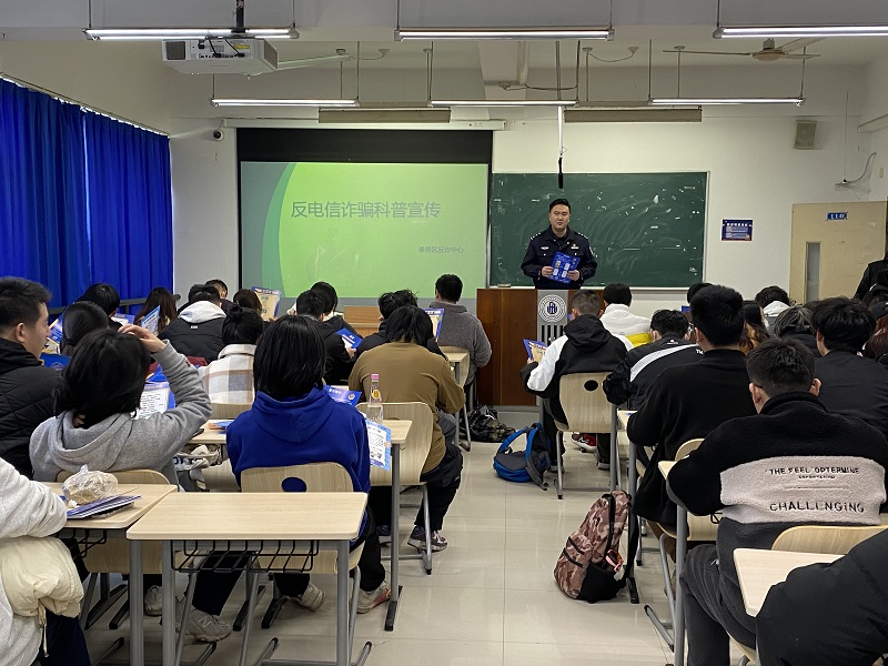 为学习国家“反诈骗”政策,提高同学们防范意识,降低同学们被骗几率,我院于3月19日至22日中午在H110开展了4次“防范电信诈骗”的课程,邀请上海市公安局奉贤分局民警担任主讲。