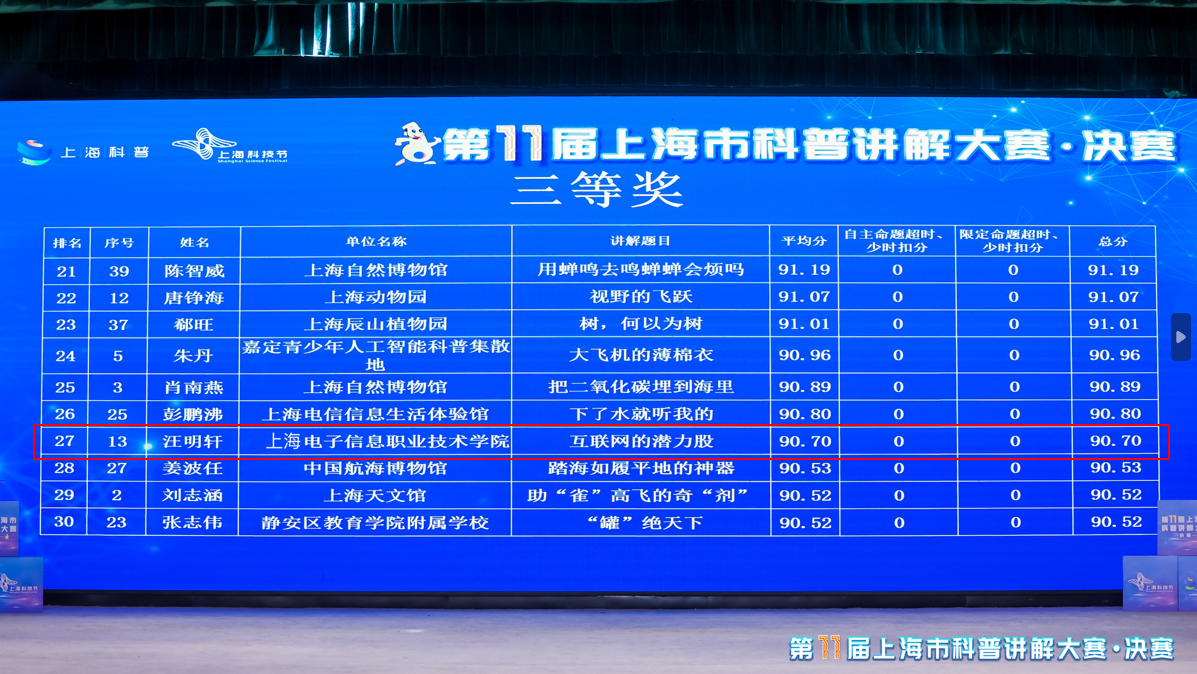 3月30日,上海市科学技术委员会主办的第十一届上海科普讲解大赛决赛在上海科普公园依弘剧场成功举行。来自上海自然博物馆、上海辰山植物园等科普基地、华东师范大学等不同行业的40名选手参与决赛,我院汪明轩同学以出色的表现荣获三等奖。
