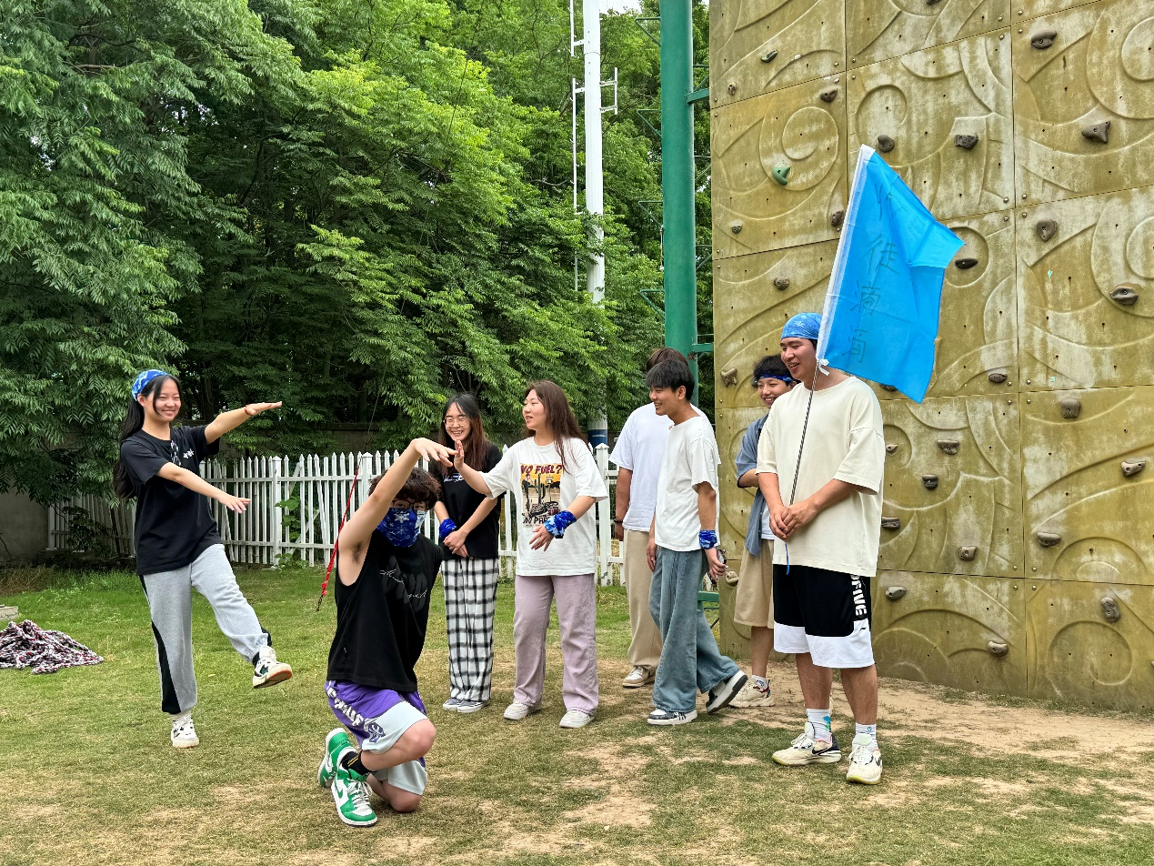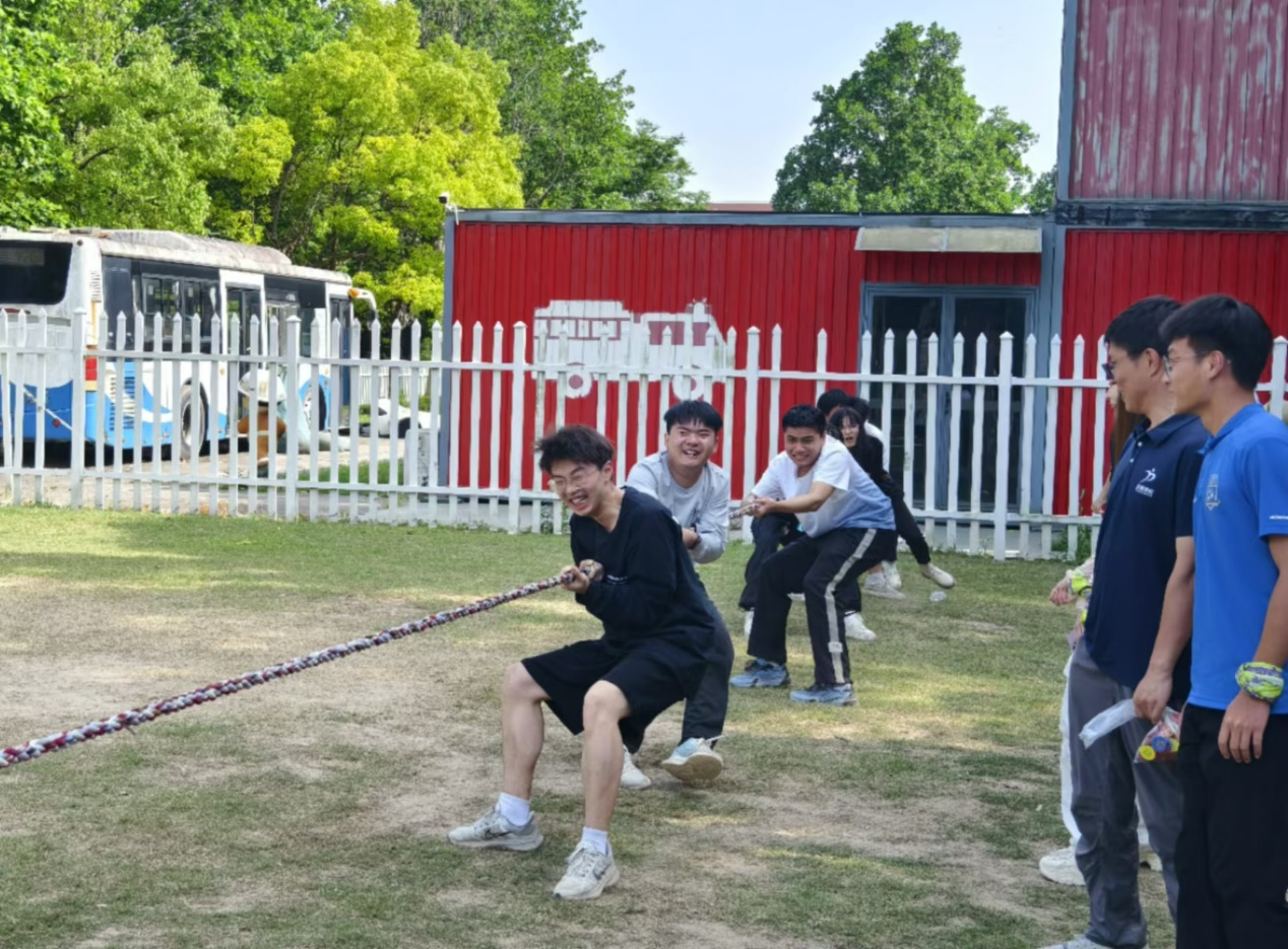 午餐过后,游戏活动继续进行。“围圈圈”游戏锻炼了大家的语言思维和协调能力,同学们手拉着手,互相帮助,展现了极强的团队精神。“美女与野兽”游戏考验了各支队伍中同学们的默契与包容。“玻璃桥”游戏则是培养大家在面对未知挑战时共克难关的凝聚力。随后的拔河比赛更是精彩纷呈,最终同学们在一片欢声笑语中决出了优胜队伍。