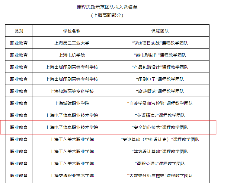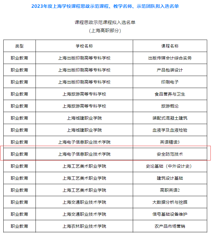 近日,上海市教育委员会发布《关于2023年度上海学校课程思政示范课程、教学名师和示范团队名单的公示》。我院建筑智能化工程技术专业《安全防范技术》课程入选示范课程,“安全防范技术”课程教学团队入选示范团队。