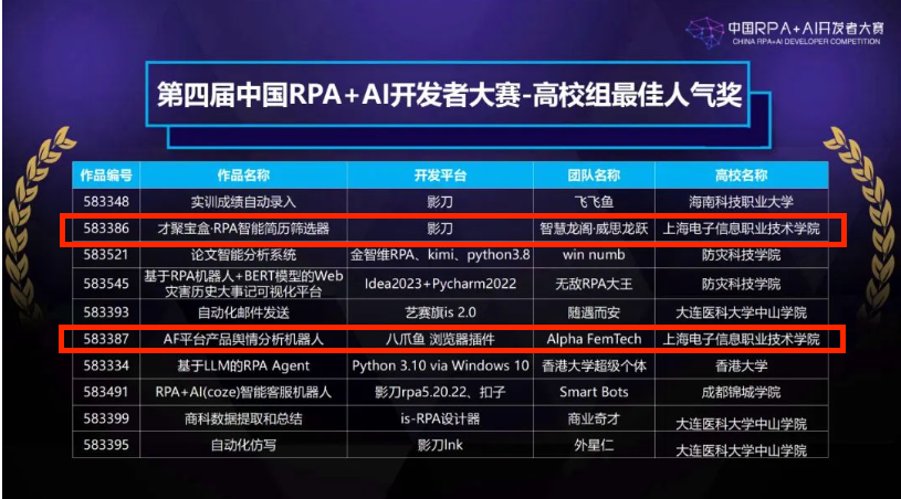 在人气奖项方面,我院的两个作品“才聚宝盒 RPA智能简历筛选器”和“AF平台产品舆情分析机器人”分别获得了最佳人气奖。这不仅是对我院作品的认可,也是对我院学生团队努力和创意的肯定。