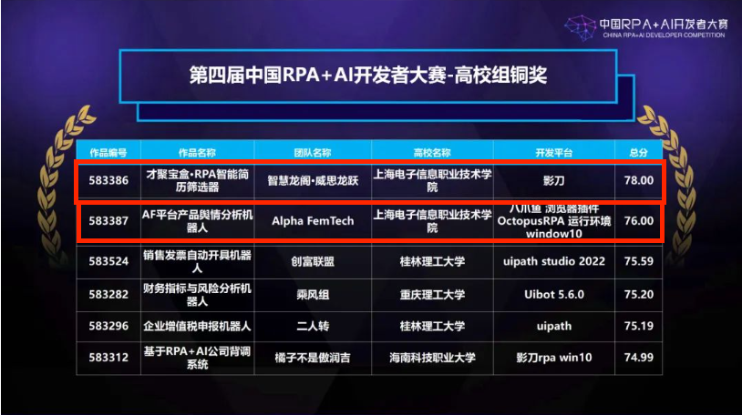 在高校组的竞赛中,我院团队的作品“才聚宝盒 RPA智能简历筛选器”和“AF平台产品舆情分析机器人”分别获得了铜奖。这些作品不仅展示了RPA技术在实际应用中的高效性和便捷性,也体现了我院学生在解决实际问题中的创新思维和实践能力。