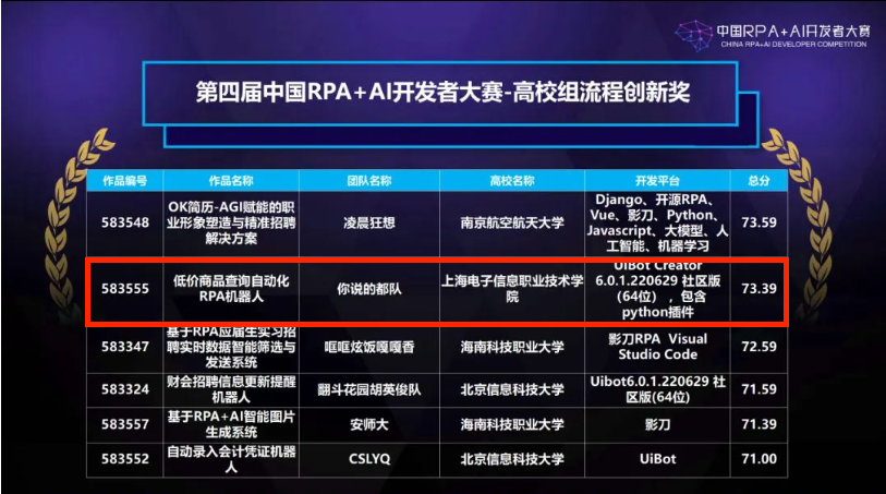 我院一直致力于培养学生的创新能力和实践技能,通过参与此类高水平的竞赛,不仅提升了学生的综合素质,也为学生提供了展示自我、与行业接轨的平台。未来,我院将继续加强与行业的合作,推动RPA与AI技术的教学和研究,为社会培养更多优秀的技术人才。(供稿:李冬梅)