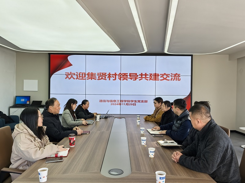 活动伊始,江龙对裴诗诗一行六人的来访表示欢迎,并介绍了我院总体情况和近年来的主要成果;胡婷介绍了学生党支部基本情况和建设情况;裴诗诗介绍了集贤村发展历史和基本情况。接下来,双方就共建交流的内容、形式、时间安排等进行了深入探讨,初步确定了党建共建合作内容:学院将根据集贤村的发展需求,在科技研发、人才培养、文化传承等方面提供更多的支持和帮助;集贤村也将为学生提供更广阔的社会实践平台,让更多的学生走进农村、了解农村、服务农村。集贤村一行六人还参观了我校国家5G移动通信虚拟仿真实训基地。
