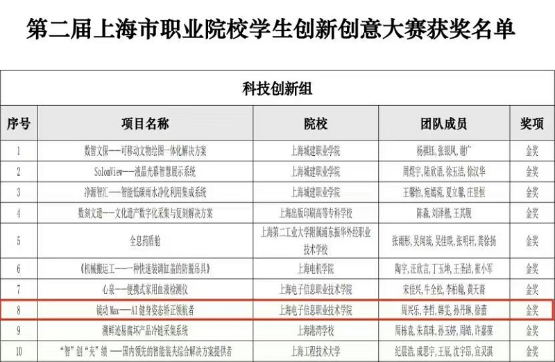 近日,第二届上海市职业院校学生创新创意大赛获奖名单公示,我院师生团队在本次比赛中表现出色,《镜动Max——AI健身姿态矫正领航者》和《非遗臻品汇——致力于成为发扬非遗文化的护航者》两个项目分别荣获科技创新组和文化创意组金奖,项目指导老师范晓燕、王乐乐荣获优秀指导教师奖!