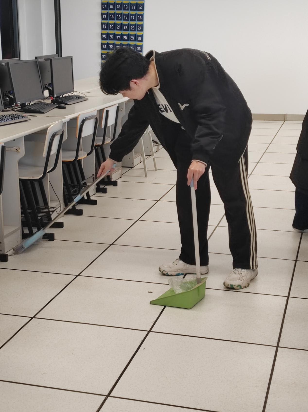 活动当天,大家迅速分组,带着扫帚、拖把、抹布等清洁工具,奔赴各自的“战场”——J楼各个教室。在教室里,同学们分工明确,各司其职。有的负责扫地,有的负责擦桌子,还有的负责整理书架和清理垃圾。大家不怕脏、不怕累,干得热火朝天。经过一个多小时的努力,原本有些杂乱的教室变得焕然一新。地面干净整洁,桌椅摆放整齐,书架上的书籍也井然有序。看着自己的劳动成果,同学们脸上洋溢着满足和自豪的笑容。