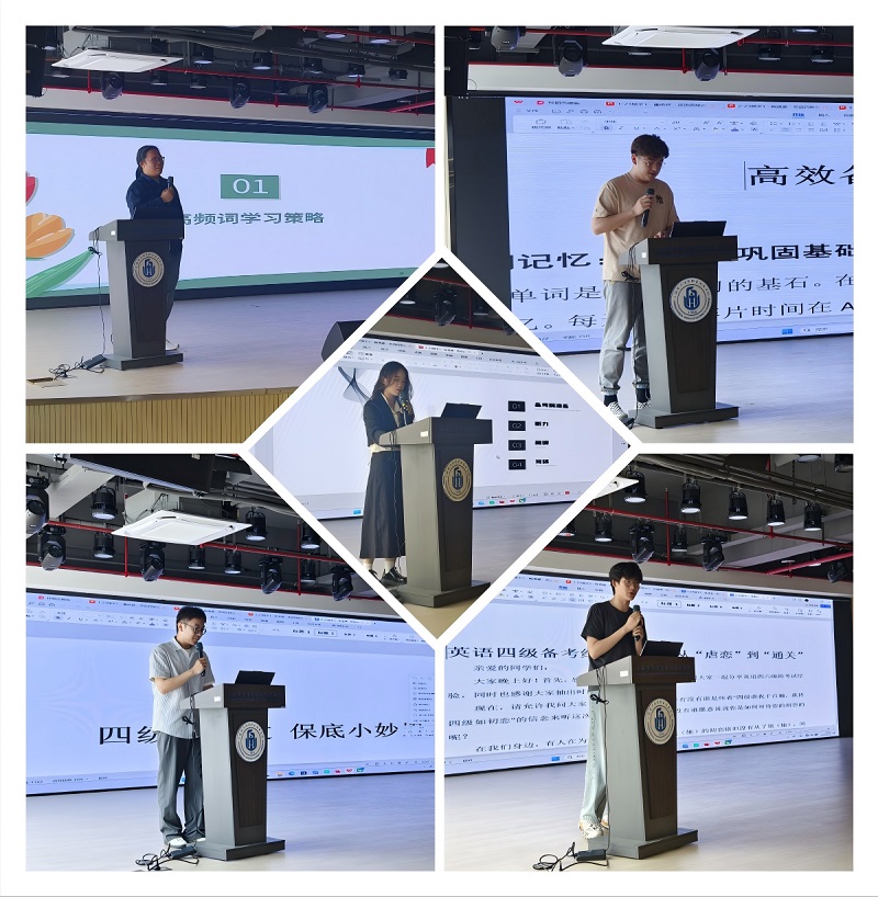 分享会上,董依依、鲍禹豪、陈卓娅、毕溢博、张陈浩、沈嘉华等六位英语学习方面的“学霸”结合自身备考经验,分别从不同角度为同学们提供了实用、高效的备考策略。董依依强调了真题的重要性,提出“吃透5套真题胜过刷10套模拟题”,并分享了考场应急技巧;鲍禹豪则从词汇、时间管理和题型优先级入手,独创“翻译遮盖法”帮助筛选生词,提倡“模块化训练+碎片化学习”模式;陈卓娅以自身逆袭经历为例,分享了“精听三步法”和“定位法”,鼓励同学们注重方法而非天赋;毕溢博作为“英语困难户”代表,提出“听力抓转折词”和“阅读研究错题规律”的策略;张陈浩建议“精听泛听结合”,并强调稳定输入的重要性;沈嘉华以幽默的方式解析真题,提醒同学们制定计划并坚持执行。活动现场,主讲人们还演示了“艾宾浩斯曲线复习法”等实用技巧,并推荐了相关学习资源。同学们纷纷表示受益匪浅,不仅学到了备考方法,更被学霸们的坚持与努力所鼓舞。