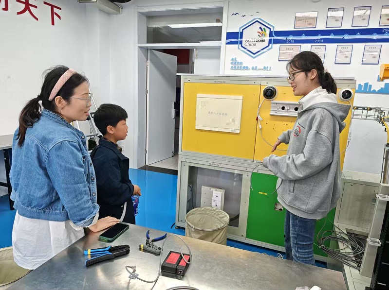 活动中,学生与家长首先走进 5G 虚拟仿真国家级实训基地,通过 3D 大屏沉浸式体验 5G 通信站点勘测、设备安装及 5G + 工业互联网工作场景,搭配 VR 头盔实现多人协同作业,仿佛化身为未来通信工程师,直观感受前沿技术在工业场景中的创新应用。随后学生和家长参观信息网络布线世赛选手培养基地,近距离观摩通信网络工程师线缆布设、端接等专业操作,深入了解世赛信息网络布线赛项的竞赛内容与职业技能标准。体验结束后,部分家长就孩子未来职业发展与教师展开深入交流,现场气氛热烈。