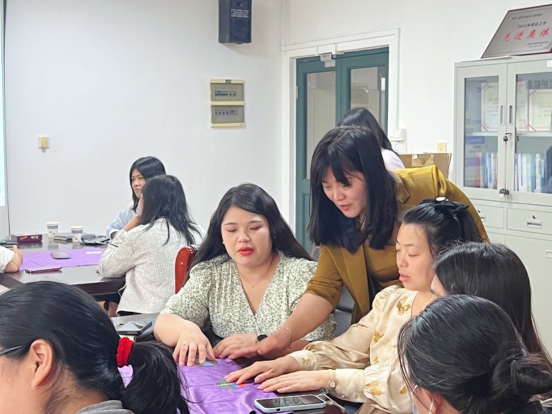 活动特邀奉贤区精神卫生中心岳菊医生担任主讲。讲座中,岳菊结合专业知识、临床经验和实际案例,围绕“自我关怀”这一核心,分享了实用的心理调试方法与压力管理技巧,为辅导员提供了极具针对性的理论指导;呼吸正念冥想训练中,老师们闭上双眼,岳医生用舒缓的语言引导大家调整呼吸节奏、专注当下感受、获得心灵上的宁静,促使辅导员将正念技巧融入日常,并以更平和的心态应对工作与生活上的压力。讲座最后,岳医生通过OH卡这一心理工具,引导老师们探索潜意识里的想法与情感,并通过卡牌的选择与解读,帮助大家进一步认识自我、关怀自我。