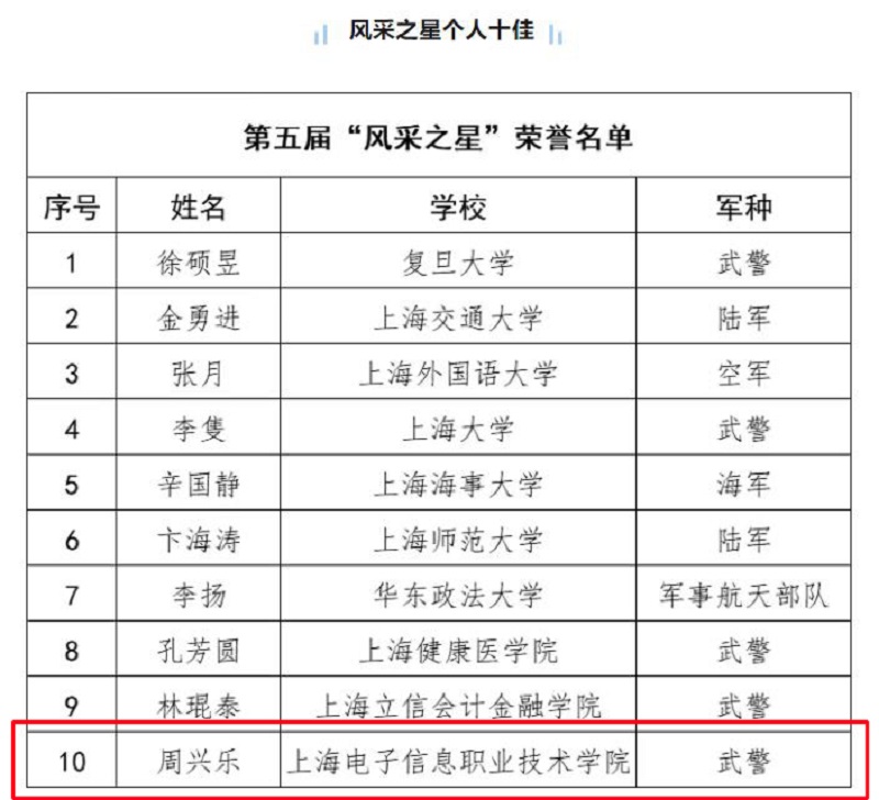 近日,由上海市教育委员会、上海市征兵办、上海市退役军人事务局联合主办,上海教育报刊总社承办的“闪耀的星 最美的你”上海市第届退役大学生士兵风采展示终评活动上海教育报刊总社举行。我院学生周兴乐荣获上海市第届退役大学生士兵“风采之星”李哲荣获上海市第届退役大学生士兵“风采之星”提名奖、龚媛媛荣获优秀文创作品