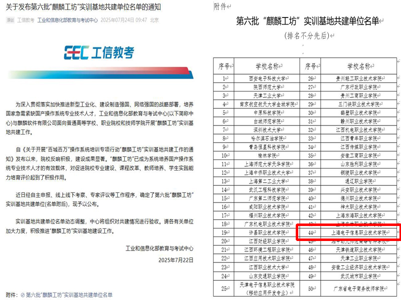 2025年7月22日,由工业和信息化部教育与考试中心联合麒麟软件有限公司共同组织的第六批“麒麟工坊”实训基地共建单位名单正式公布。我校成功入选,成为国家级信创产教融合平台的共建院校之一。