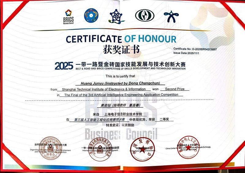 “一带一路”暨金砖大赛是促进金砖国家间技术交流与合作的重要平台,人工智能工程化应用赛项聚焦于前沿技术在实际场景中的部署与优化。黄俊钰、徐天宏两位同学的获奖,不仅是对其个人刻苦钻研和辛勤付出的肯定,也是对我院在人工智能领域人才培养质量和教学成果的有力证明,充分体现了学院在深化产教融合、提升学生实践创新能力方面取得的显著成效。